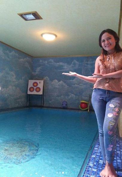 8. Ruang berolahraga Inul Daratista ini letaknya tepat di samping kolam renang.